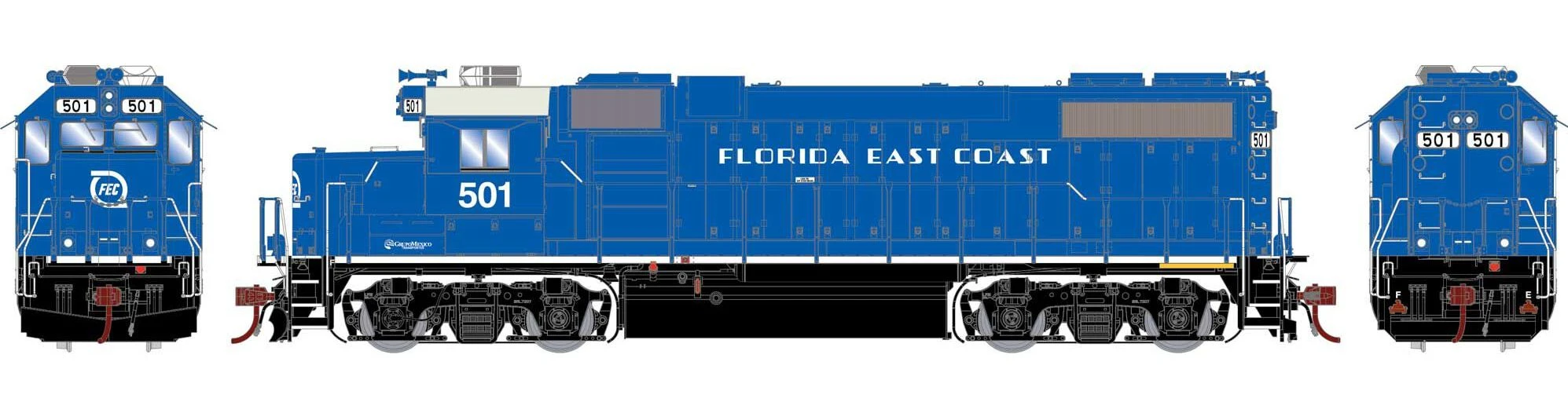 Starting in 1972, the FEC acquired 11 of these GP38-2s. These locomotives came equipped with Oscitrol lighting and Leslie RS3L horns. These GP38-2s are still in service today having gone through several rebuilds. Taking off the Oscitrol lighting from their nose and adding front and rear ditch lights, and RV AC units to their roof.