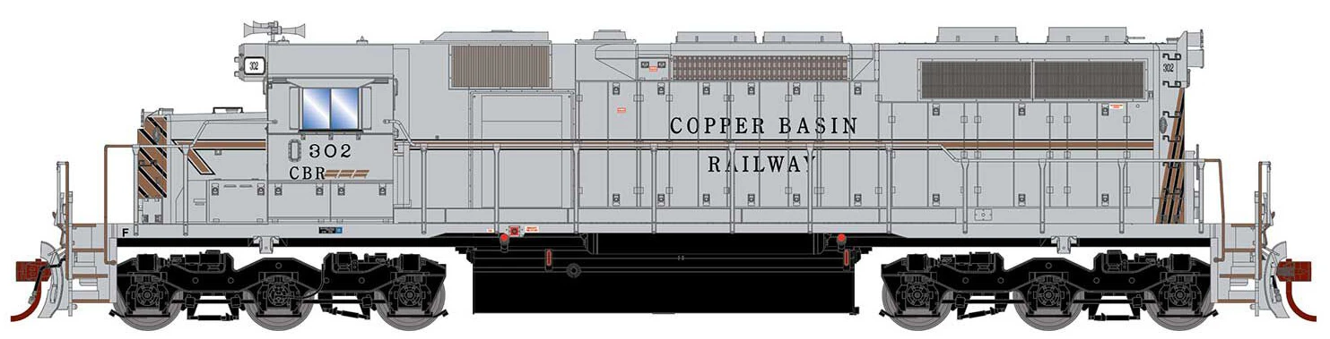 In the late 1980s, Copper Basin RY picked up some surplus Ex-SP SD39’s for their copper concentrate trains in AZ. When purchased, they were kept pretty close to the old SP-specs other than the removal of some of the oscillating lights and the bell being moved to the long hood. They were repainted into this unique copper and grey paint scheme. Our models depict these details such as: front and rear large plows, rear brake wheel, P-3 Horns, FARR grilles, removed red warning lights, and road number-specific trucks and headlight placement.