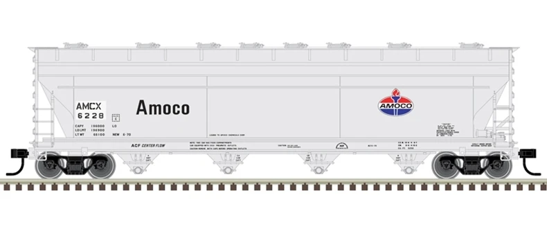 ACF introduced the 5250 cubic foot size covered hopper in 1964, and has since built nearly 20,000 cars. Most of the cars were equipped with pneumatic outlets and eight 20″ round hatches for use in transporting plastic pellets. In addition to the plastics cars, a number have been built or converted with gravity outlets and elongated hatches for grain type products. As with most things with long production spans, the design has evolved with changes in the physical features of the body and fixtures. The Atlas model features three unique body style variations to represent those changes from the 1960s into the 21st Century.