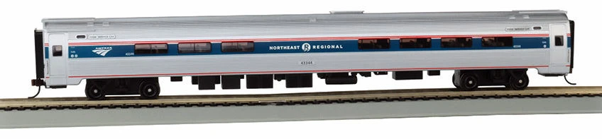 In service since 1975, the Amfleet passenger car is a frequent sight along the Northeast Corridor. Now sporting the Phase VI scheme with prototypical markings and colors.