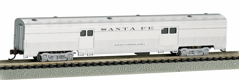 Bachmann Silver Series N 14651 72′ Streamline Fluted-Side 2-Door Baggage Car, Santa Fe “Railway Express Agency”