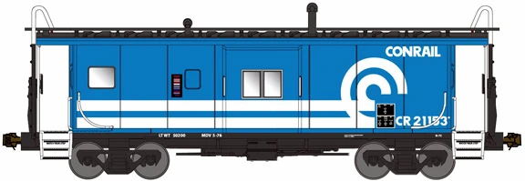 Conrail inherited these Phase 4 cabooses from Erie Lackawanna. At least two of the cars received this paint scheme featuring the largest wheel-and-rail logo ever applied to Conrail cabooses. For reasons known only to Conrail shop forces, these two cars were re-painted without removing the running boards or ladders.