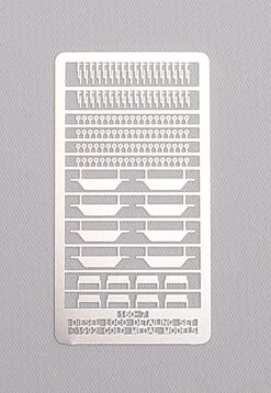 Set contains 36 windshield wipers, 76 lift rings, 8 cab sunshades, and 8 rear view mirrors designed for diesel locomotives. These are etched in .005″ stainless steel eliminating the need for painting.