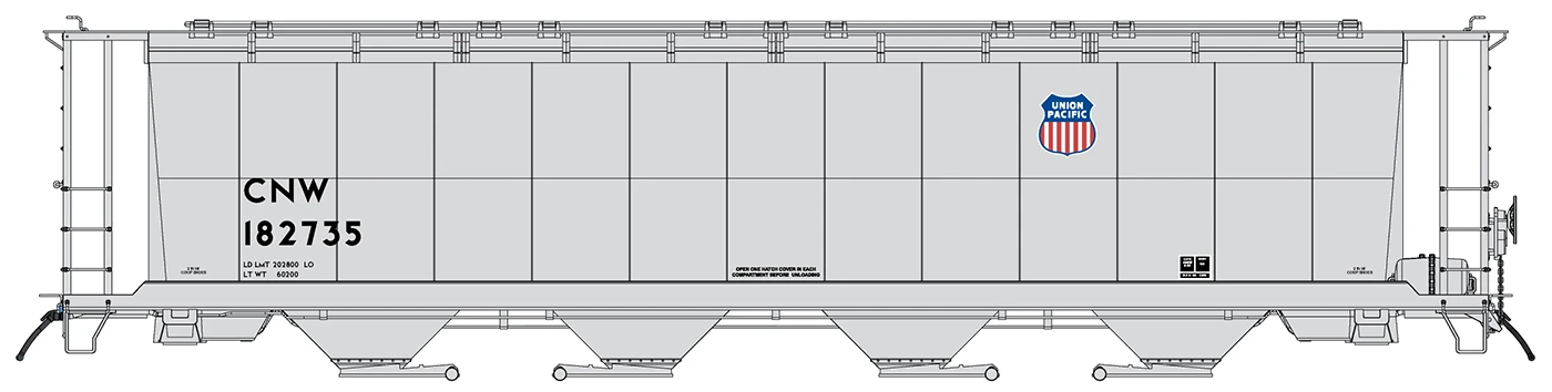 The trough hatch cars feature road name specific parallel ribbed roof hatches, diagonal ribbed “zig-zag” roof hatches, or smooth flat hatches as per the prototype. All cars feature etched metal roof walks, laser sharp painting and lettering, accurate colors, 100 ton trucks with InterMountain 36″ precision metal wheelsets, and knuckle couplers.