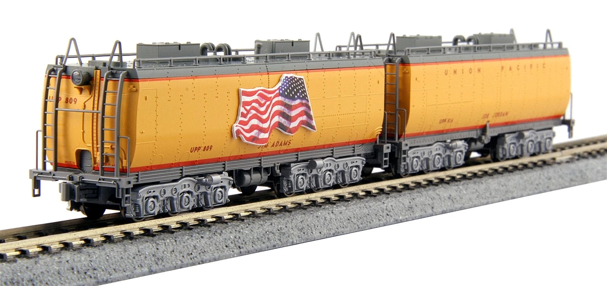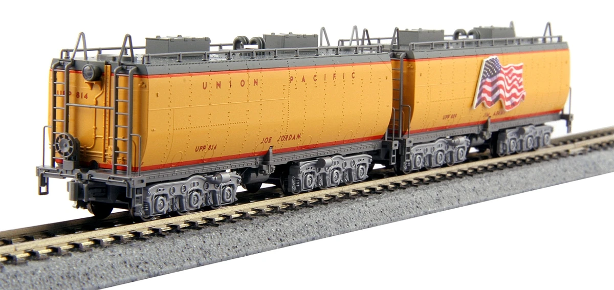 These cars are based on the colorful auxiliary tenders that operated behind Union Pacific’s steam locomotives in excursion service. The “living legend” FEF-3 is always accompanied by at least one pair of these water tenders, which carry spare water for the steam engine since water filling stations became a rarity in the diesel era. They also saw service as gas turbine electric fuel tenders before settling into their current forms as part of Union Pacific’s steam heritage fleet where they operate as separate (but always present) cars. This 2-car set includes water tenders UPP #809 “Jim Adams” with American flag and UPP #814 “Joe Jordan” lettered for Union Pacific. Just like the prototype models, the two tenders are not identical, having (in addition to one car having an externally mounted American Flag plate) different weld mark details which are replicated on the models of the two cars, preserving their unique spirit when translated into model form.