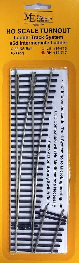 This unique system of five different #5 turnouts allows you to make more compact yards in a given space. The system includes curved diverging track turnouts, which allow a higher ladder track angle, several lappedturnouts and a standard #5 turnout.