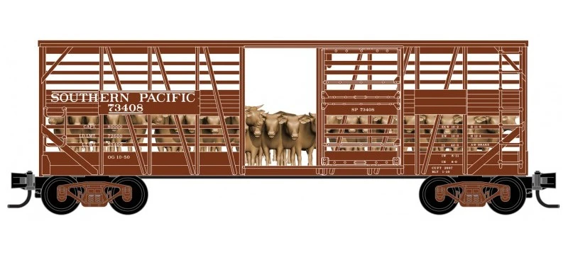 These stock cars with Bettendorf trucks were built in 1917 and rebuilt by Southern Pacific in 1950. Southern Pacific was a Class 1 railroad from 1865 until 1996, when it was absorbed by Union Pacific after falling on hard times financially in the 1970s and 1980s.