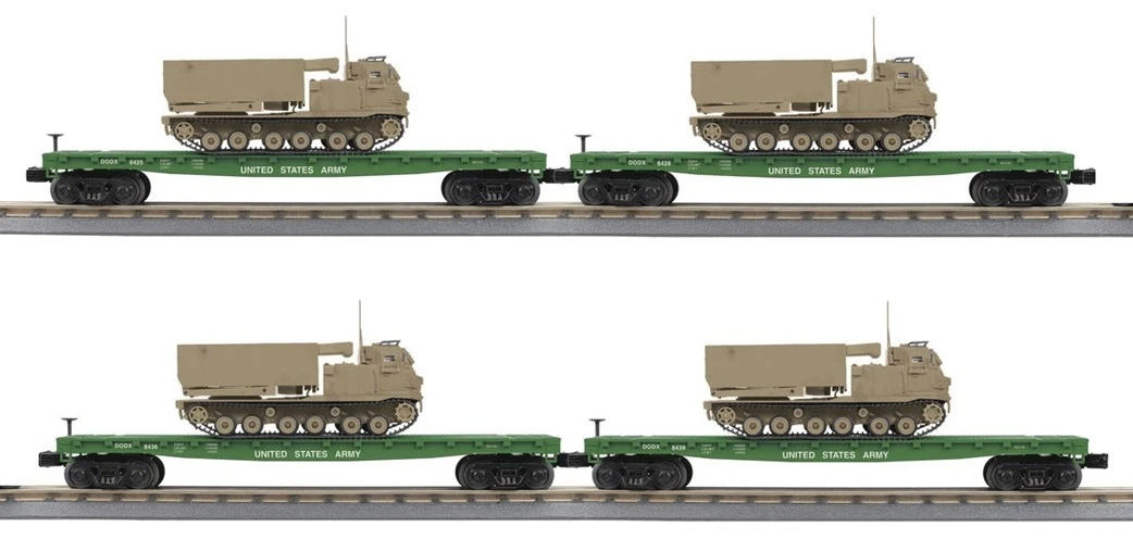 MTH RailKing O 30-70120 4-Car Flat Car With M270 Rocket Launcher Vehicle Set, US Army