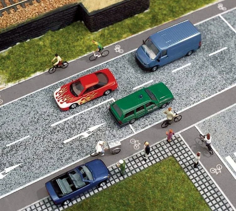 Pave HO scale roads, streets and highways quickly and easily with Walthers SceneMaster Flexible Self-Adhesive Paved Roadway sets! Made from a unique flexible material that’s self-adhesive, simply combine straight sections, and curves, or cut to fit and press in place. Each features a realistic surface color, as well as appropriately colored centerlines and “fog lines” along the outside edge of the pavement for modern or vintage paved roadways.