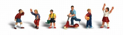 A set of six children riding scooters, waving, carrying a lunchbox, calling out, and playing.