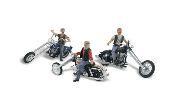 Three bad-boys, complete with do-rags, tattoos and pony-tails, set ready-to-ride on their custom choppers.