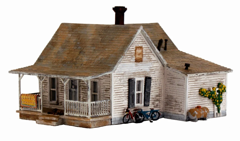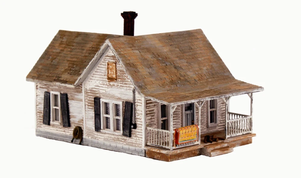 The Old Homestead, is a bit rough around the edges and the prefect representation of an old rural bungalow, beautifully weathered and loaded with detail. Features include an outhouse, rusting propane tank, a couple of old barrels, a mailbox, old Bowser asleep on the front porch and more. The suggested pairing with this Old Homestead is the Old Weathered Barn to set a complete scene. Colors may vary from actual product.